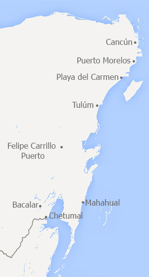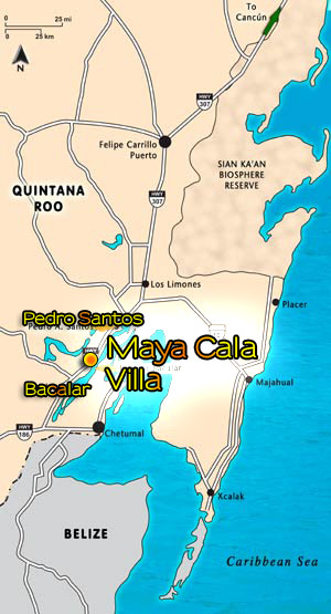 Maya Cala Villa is located just off highway 197 between Bacalar and Pedro Santos. About 15 minutes from Bacalar and 10 minutes from Pedro Santos.